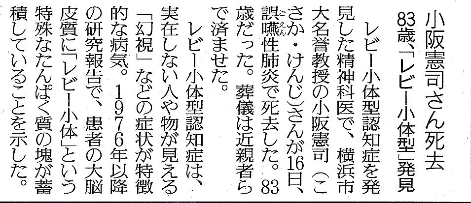 第三の認知症ともいわれる「レビー小体型認知症」を発見された小阪先生が3月16日亡くなられた。
