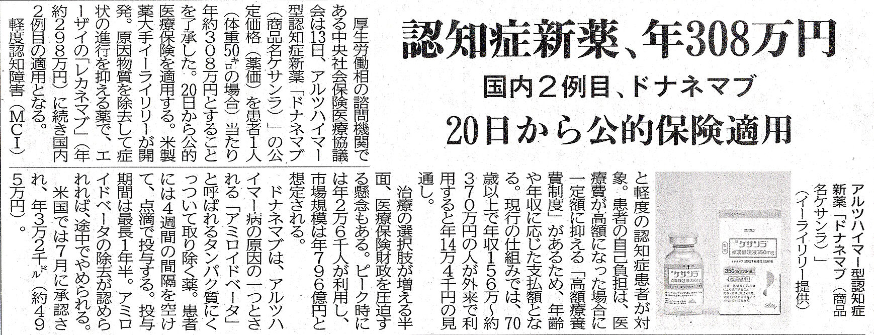 私の施設からも大学病院へ紹介し、1人ではありますが「レカネマブ(レケンビ)」の治療が行われていますが、同種薬剤である「ドナネマブ(ケサンラ)」の保険適用がきまり、体重50kgと仮定した患者さんの薬価が1年あたり308万円にきまりました。